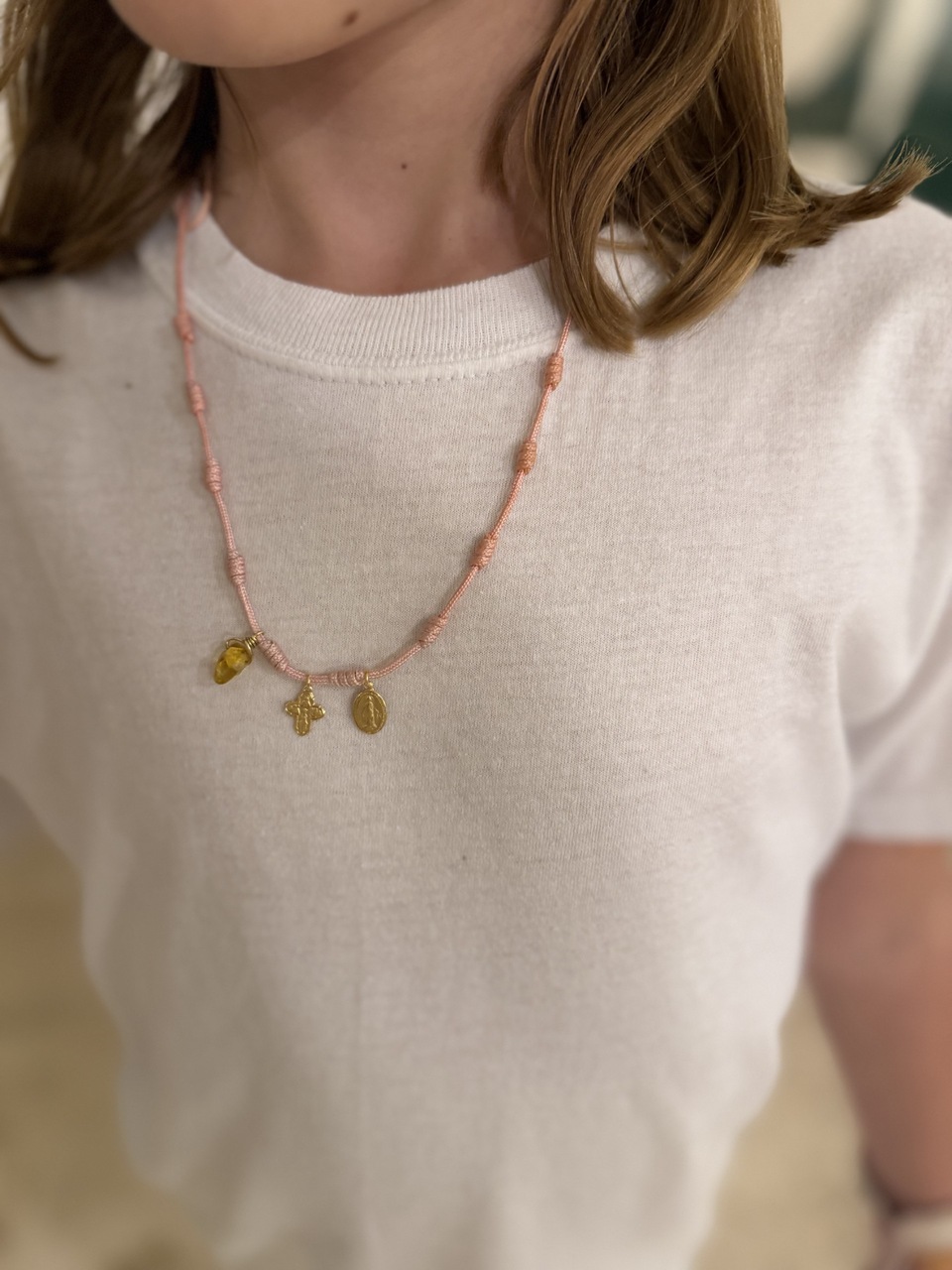 Colar Valência. Pingente em Âmbar e Ouro Amarelo Reciclado 18k, Crucifixo e Medalha Nossa Senhora em Ouro Amarelo 18k. Mede 35cm fechado ou 45cm totalmente aberto.
