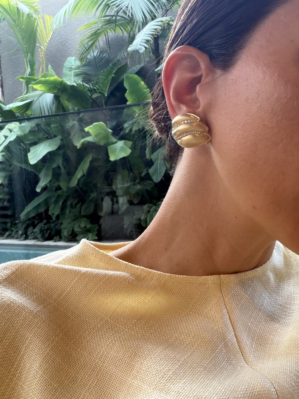Brinco Duna Cravejado. Peça com 17g Ouro Amarelo 18k Reciclado e 0,88 ct de Diamantes Natuais. Mede 3cm de altura e 2,5cm de largura.