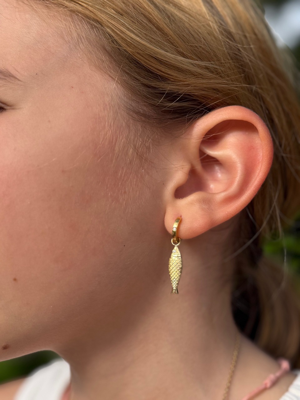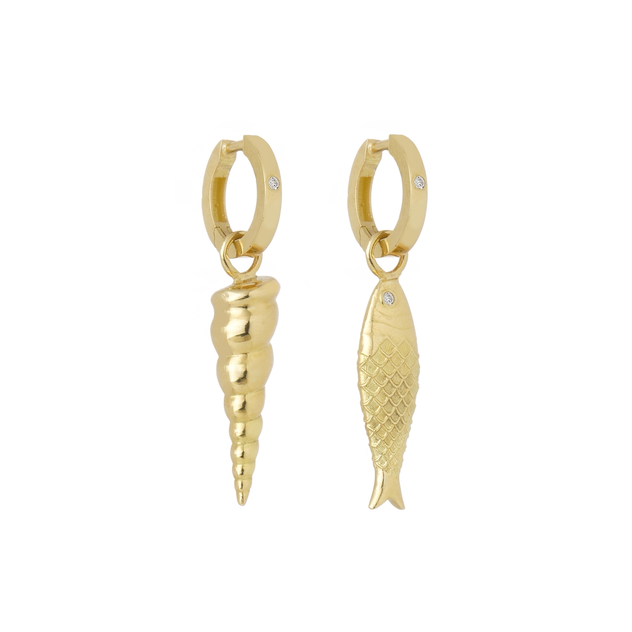 Brinco Mar. Peça com 4,12g de Ouro Amarelo 18k e 3 pontos totais de Diamantes. Pingentes Concha e Peixe com 1,9cm de altura e argolas com 1cm de diâmetro.